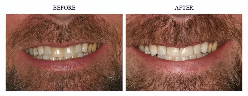 This patient also achieved a huge “bang” with a fairly limited treatment plan. His teeth were badly discolored, especially his right front tooth. We Zoom bleached all his teeth and then only restored his 2 front teeth with porcelain veneers. The porcelain needed to be custom matched at the lab to his new bleached shade and the final result was phenomenal! In the future he may replace some of the older, darker porcelain restorations on his back teeth, but for now we were both amazed at what a difference just transforming the color of his front teeth made!